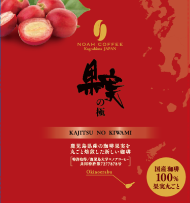 コーヒーの赤い果実の成分に着目し、国内で豆を収穫しているからこそできる独自の製造過程で、実を丸ごと焙煎する方法を考案。鹿児島大学と共同研究し、遠赤外線でトリゴネリン※の成分を失うことなく焙煎した果実入り珈琲です。(特許申請済)